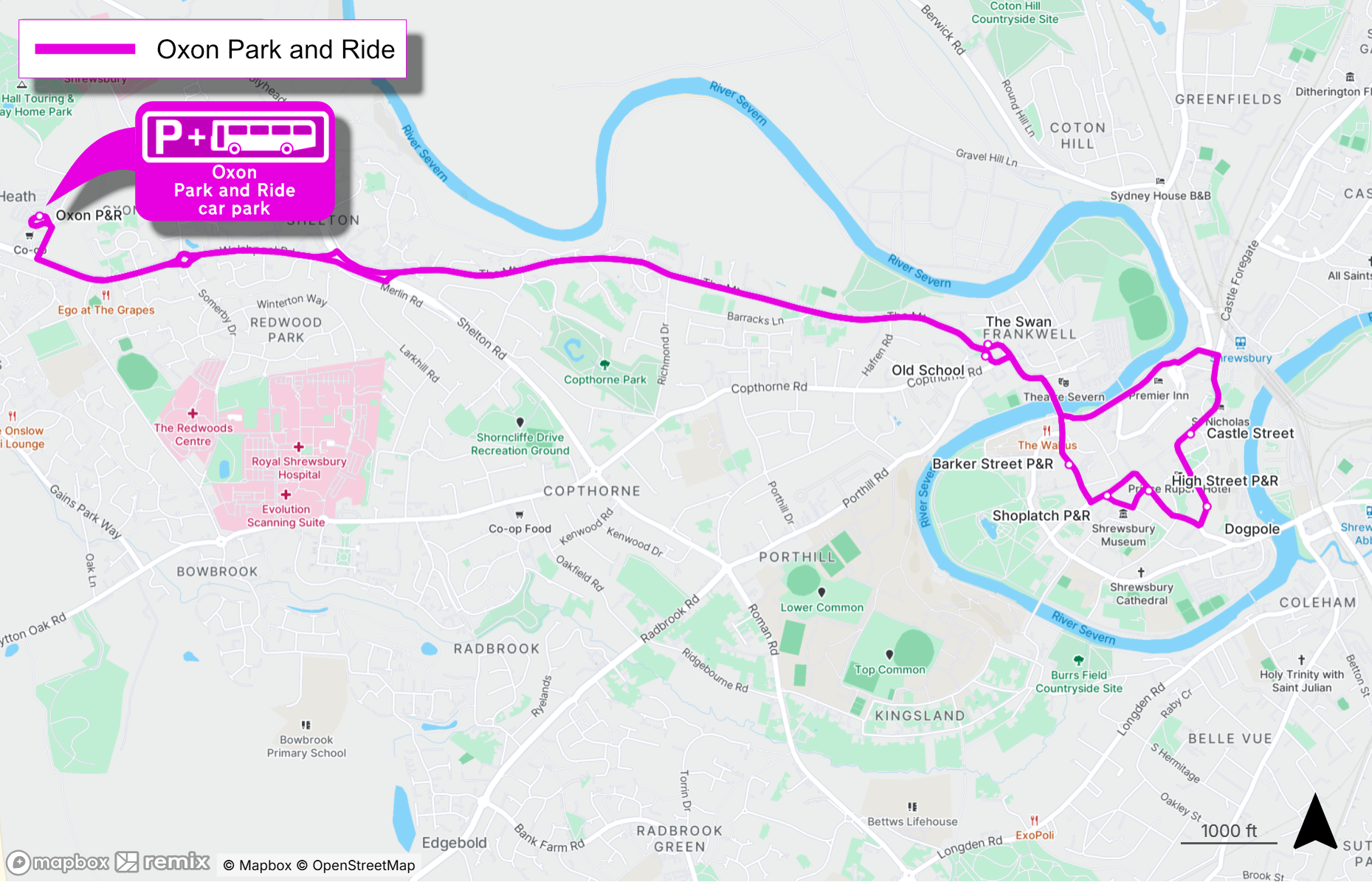 The Oxon Park and Ride service stops at the following locations in Shrewsbury town centre. Click on each link to be taken to a Google Maps location for each stop: