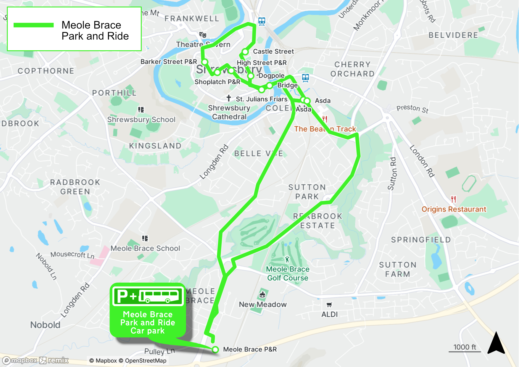 Take a look at the Meole Brace Park and Ride route map to view the full route for this service.