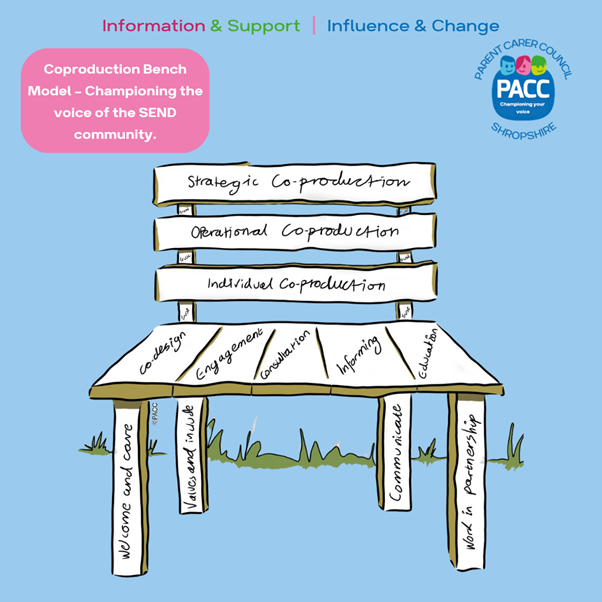 This is about the system working with the SEND community to increase the positive impact of its collective work in a specific area. It helps us to work with a variety of partners and makes sure that the community voice influences and informs system wide planning and priorities. In Shropshire, PACC provide representation to the SEND Partnership on behalf of the parent carer community and champion the needs of families with SEND from across Shropshire at a strategic level.